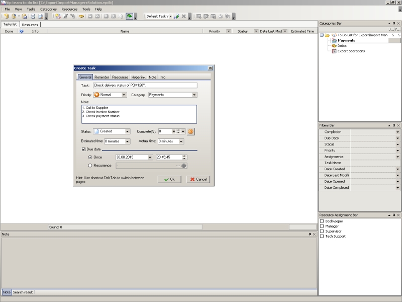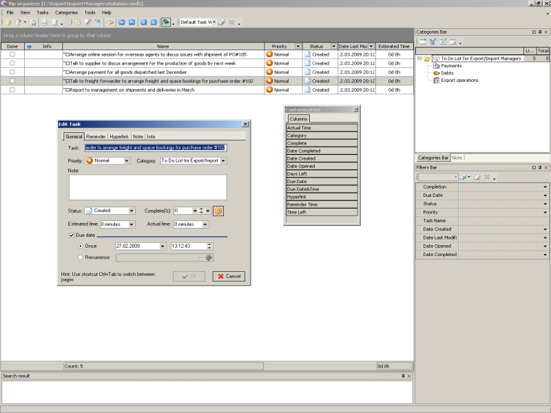 Any work can be more effective and well organized if it is broken down into simple tasks and activities that are easy to manage and control. The way to get it is to use to-do lists. The work of export/import manager can be organized by using to-do lists. For each job he can create a list of tasks that should be done within a definite term. In task management software export/import manager can use to-do lists as a tool for organizing his jobs. To-do lists can be organized into categories. For example, in task management software there can be created such categories as "Export operations", "Import operations", "Payments", "Debts", etc. Export/import manager can add to-do lists to these categories to specify step by step action plan. As an example, in category "Payments" he can specify such tasks as "Check outstanding payments for December", "Prepare invoice for payment", "Check payment date for all unshipped orders" and other. Task management software allows to use subgroups and so create tree-like structure for to-do lists. This makes the work of export/import manager more organized and effective.