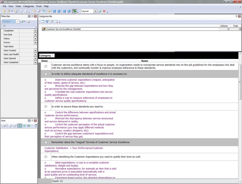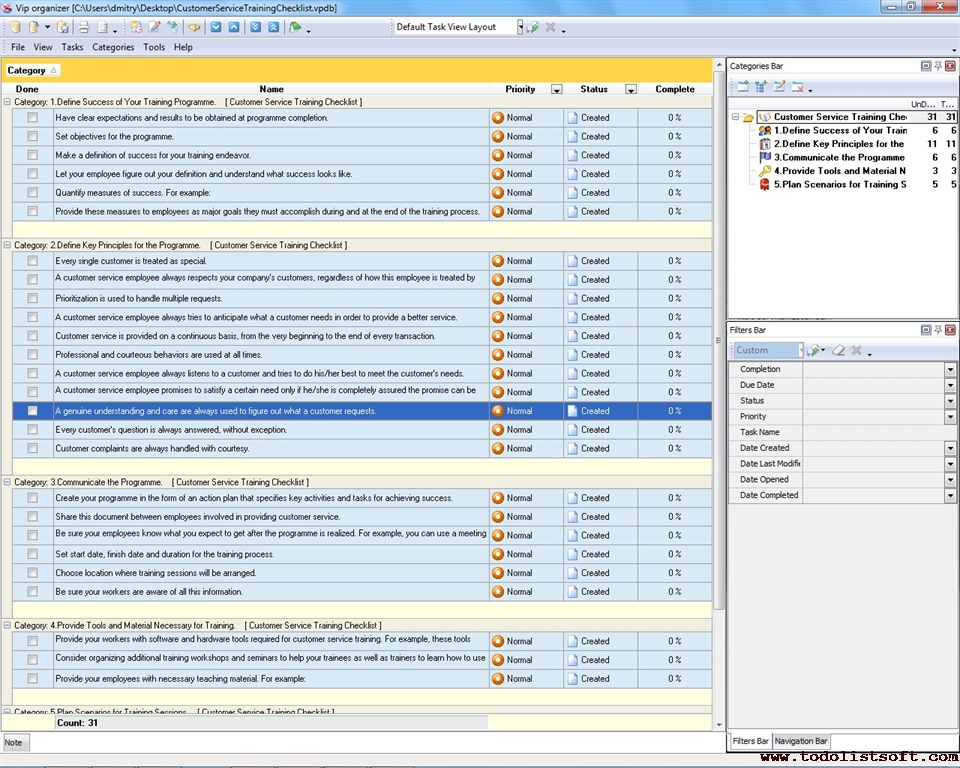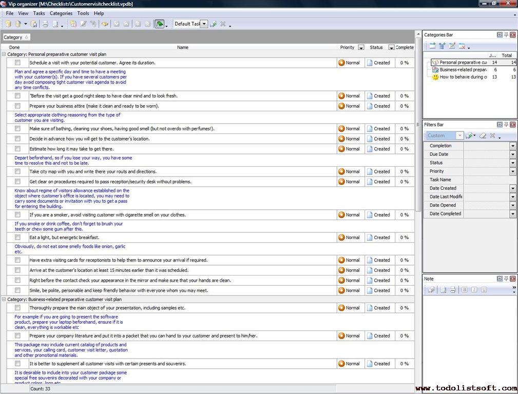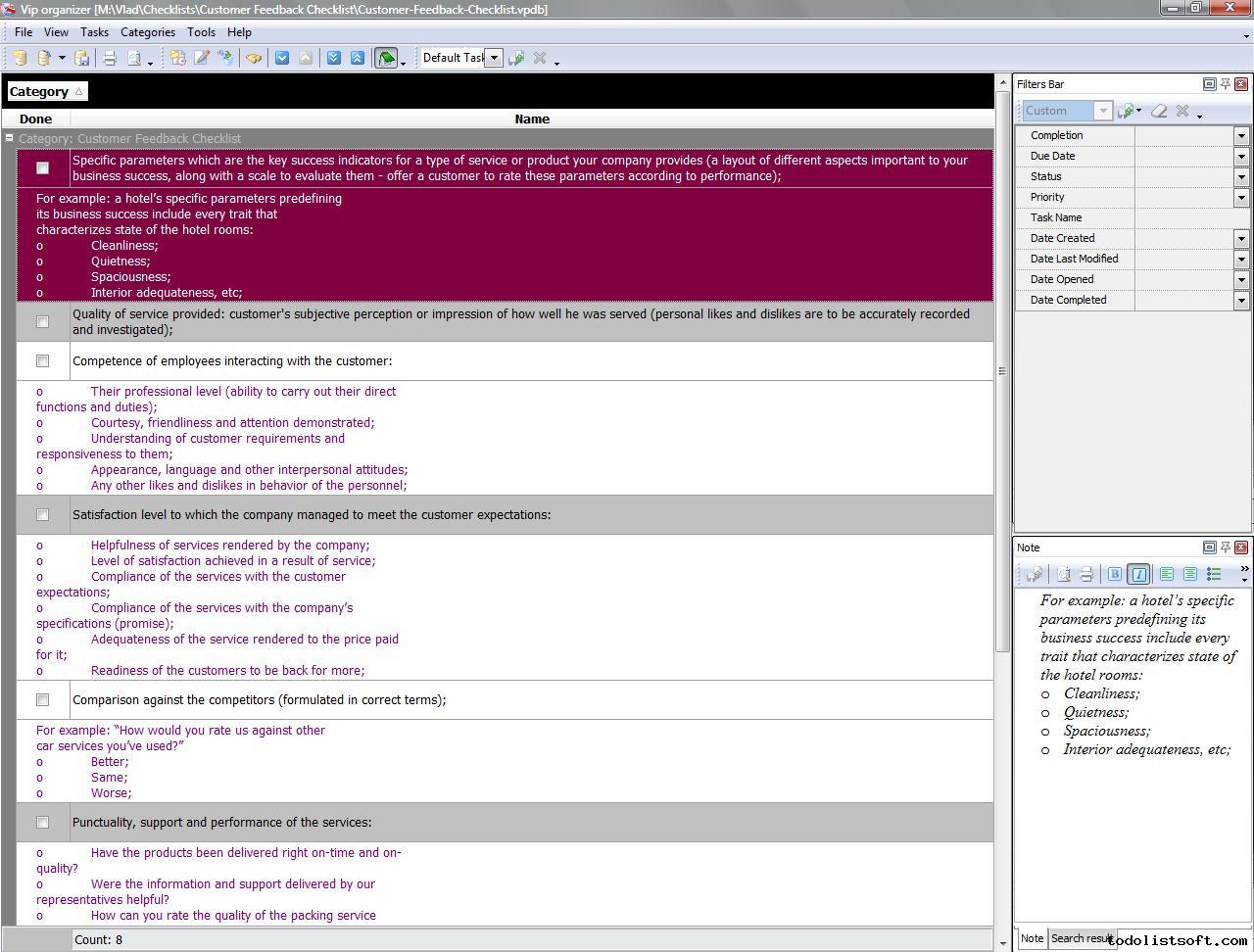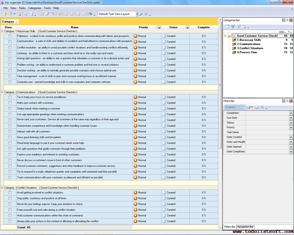 This Good Customer Service Checklist presents guidelines and suggestions regarding the best practices of managing customer service in companies. It will be helpful for personnel from Sales, PR, Support, Purchase and other departments. The checklist can be uploaded to VIP Organizer software and used as a simple to-do list.