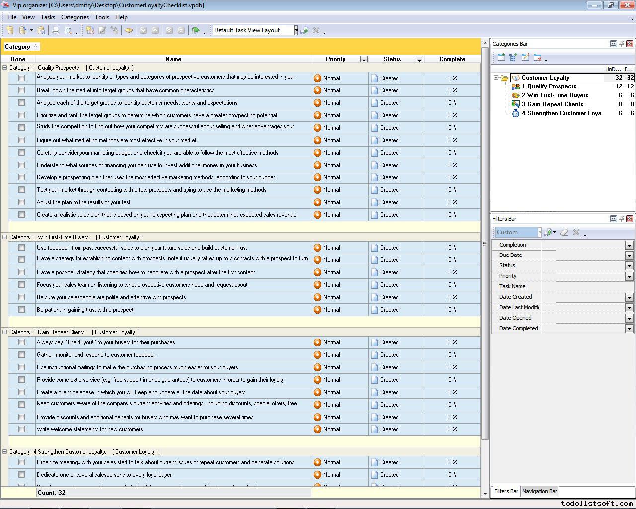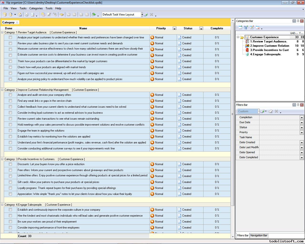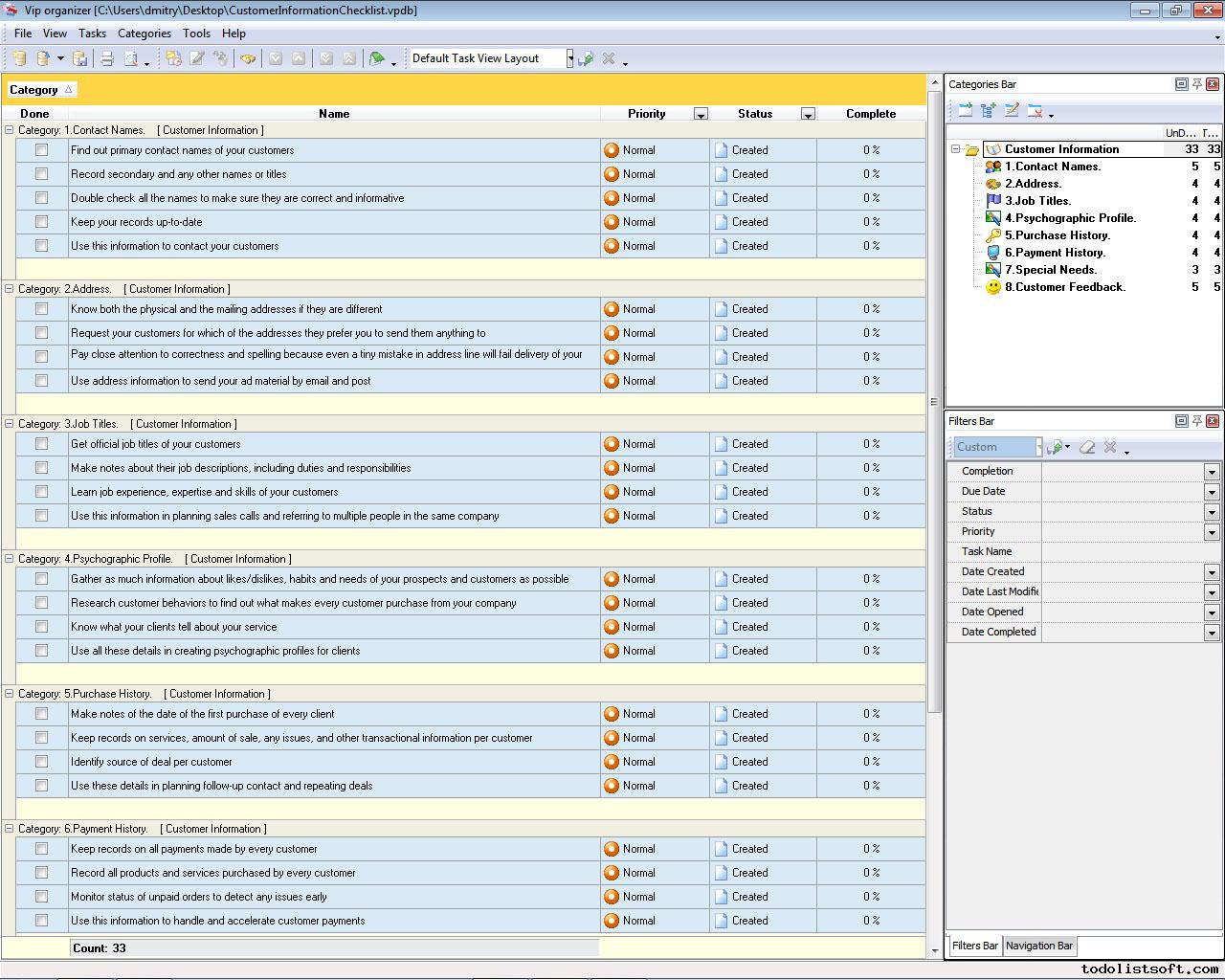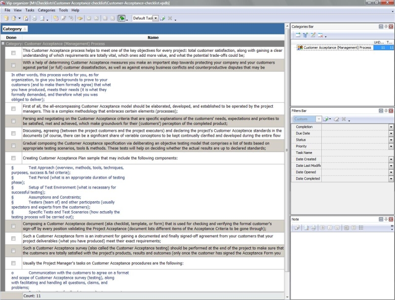 This Good Customer Service Checklist presents guidelines and suggestions regarding the best practices of managing customer service in companies. It will be helpful for personnel from Sales, PR, Support, Purchase and other departments. The checklist can be uploaded to VIP Organizer software and used as a simple to-do list.