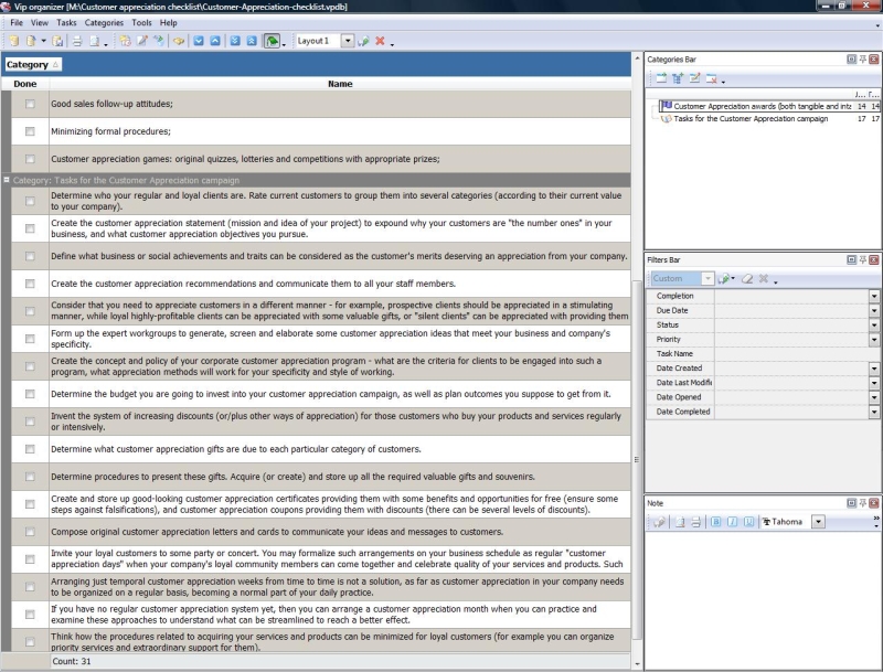 This Customer Appreciation checklist will be helpful to any business manager who would like to study some ideas on how his company can express gratefulness to its clients who add real value and sense in everything that business does. It is very important to appreciate your clients as they contribute their investments, vision and ideas into making your business attitudes and conceptions better, and as a result they help you to refine your way of getting revenues. This Customer Appreciation checklist gives you an overview on customer appreciation awards, and also on how to organize customer appreciation campaign.