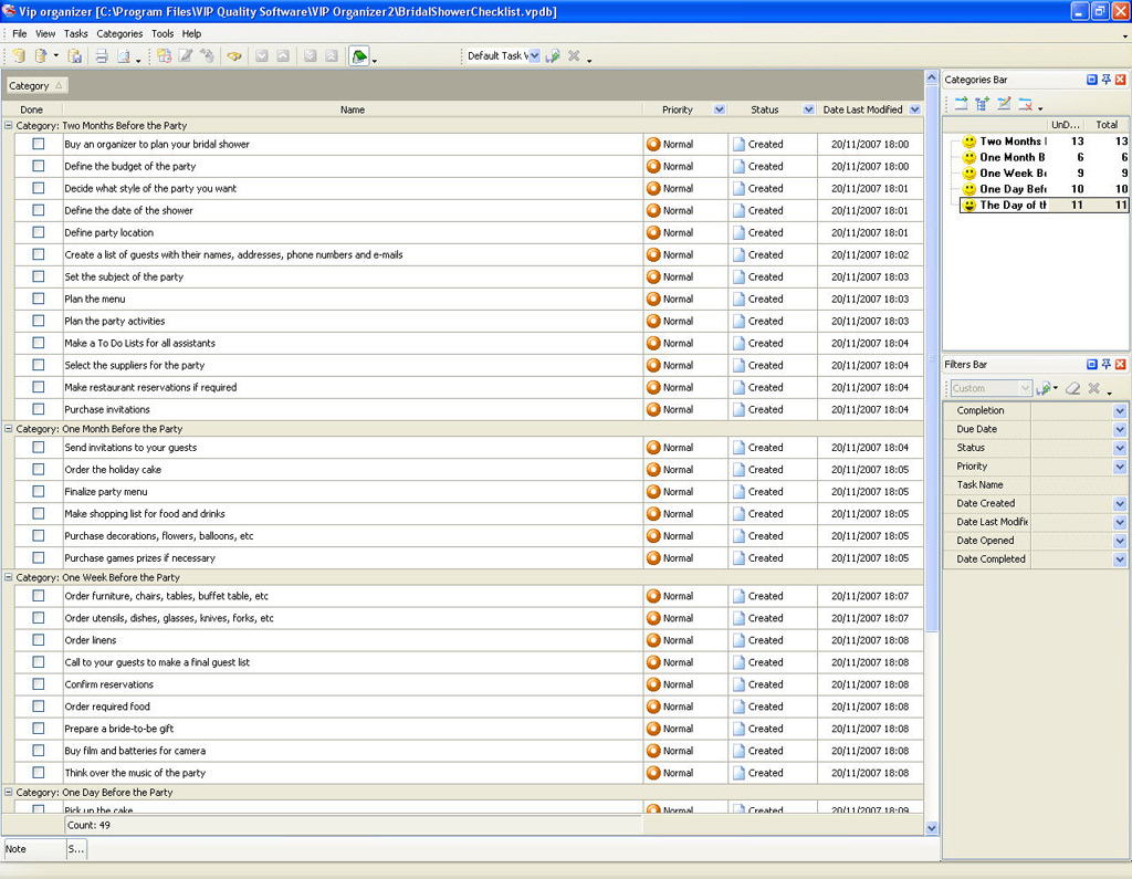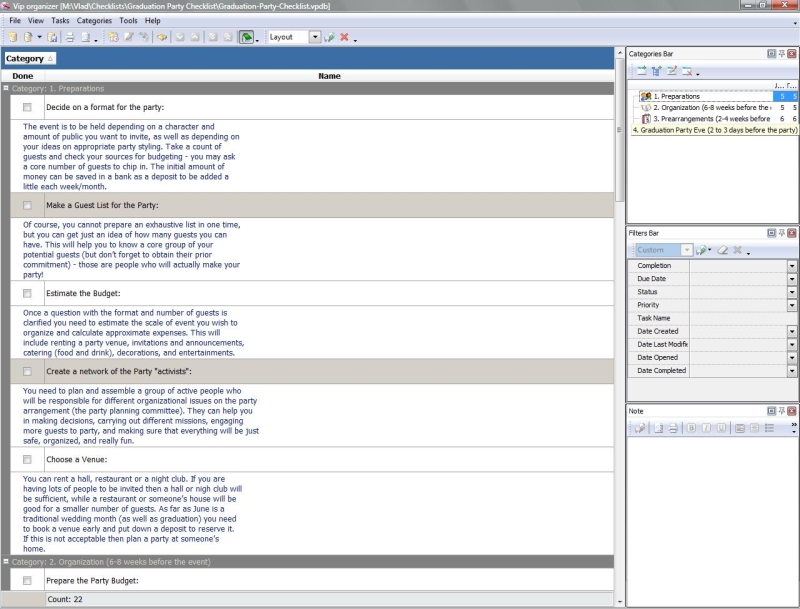 Party Planning Checklist is a 'to do list' for you to make sure that you take into account all details concerning your future party. Use this Party Planning template as a checklist to organize everything and be able to entirely enjoy the party.