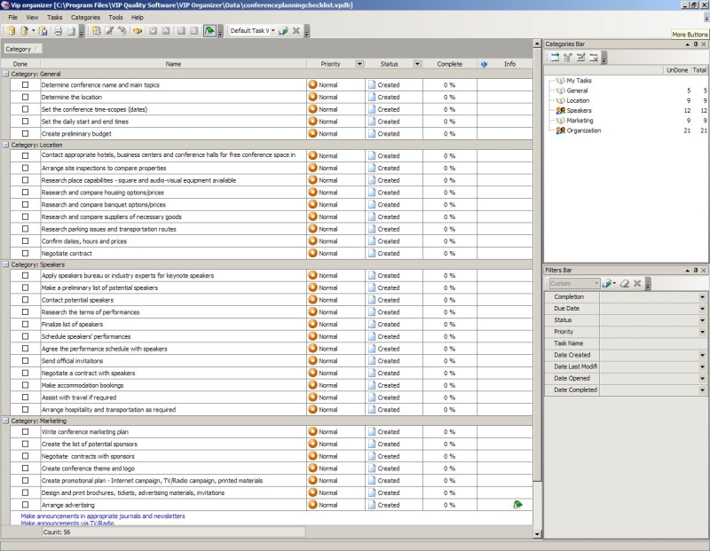 Conference Planning Checklist - can be useful when arranging of conference is required. Conference planning is very complicated arrangement and it is obvious that all conference planning tasks cannot be kept in mind, so appropriate checklist is necessary. This conference planning checklist was elaborated to facilitate the process and include various activities that should be performed to assure the successful conference organization. It can be easily and quickly modified, supplemented with details by user according to user's requirements.