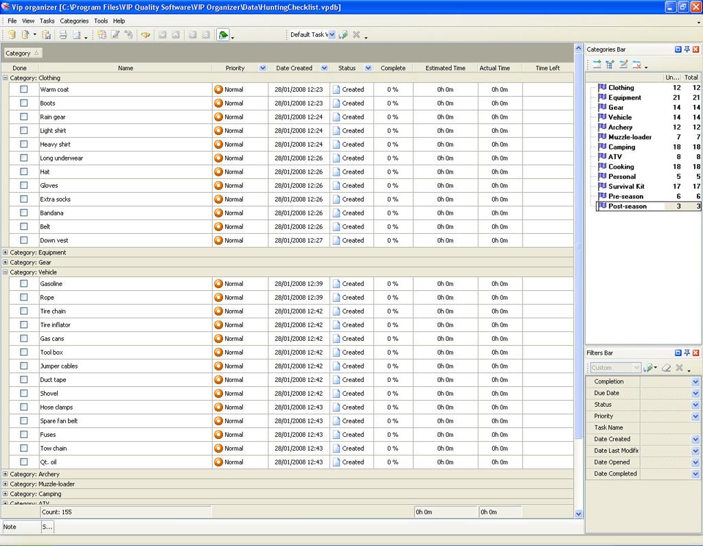 Hunting Checklist is a 'to do list' for you to have everything ready for a hunting. Use this Hunting template as a checklist to prepare required equipment, clothes and first aid kit beforehand to be able to enjoy hunting.