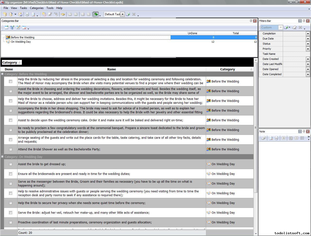 Maid of Honor Checklist is created to support maiden girls who are going to be Maids-of-Honor during the wedding of their friends. With a help of this checklist you can learn how important this ceremonial role is and what essential duties it includes prior to and during the wedding.
