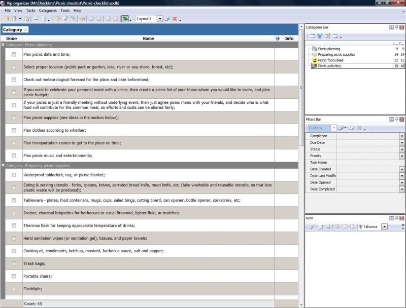 This picnic checklist will be helpful to everyone who wants to arrange an easy-going outdoors meal (picnic party) with a few fun activities to promote communication between friends and enjoy shared open-air rest. This all-round picnic checklist will help you to plan the picnic place and organization, and will give you some ideas on picnic supplies, foods, and interesting entertainments.