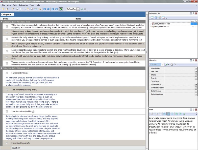 This Baby Milestone checklist is a brief chart (with explanations and tips) of baby milestone events on the glorious path through his/her early period of development (8 weeks-24 months). With a help of this Baby Milestone checklist you can learn how your babe is supposed to grow (however, this is not a strict rule for everyone, but just the most common way which supports different variations).