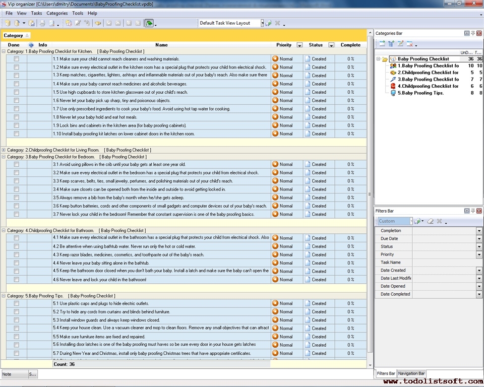 This useful Baby Proofing Checklist includes a series of household precautions and recommendations that will help make any house safer and more convenient for children. It will be very helpful for parents whose baby just begins to crawl.