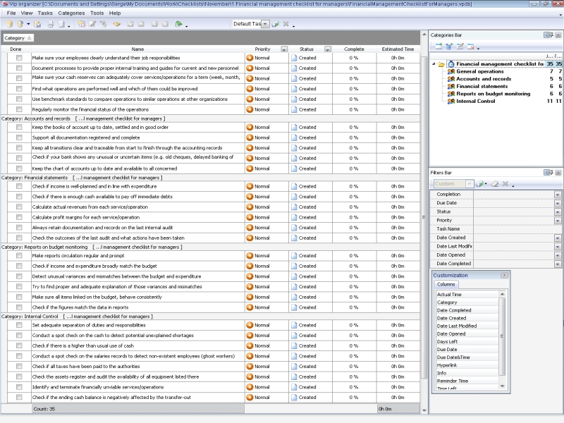 Finance Department Checklist is composed for the business administrators who want to establish appropriate departments in their companies. In this checklist you can find a list of specific functions and activities that are peculiar to financial departments (the financial and accounting affairs).