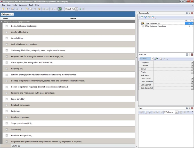 This Office Equipment checklist is created for those people who wish to start their own business, and therefore need establishing their own business office premises. With a help of this easy-to-read Office Equipment checklist you will learn a solid list of office equipment examples (machinery and other things) that you may need to acquire for ensuring normal activity of your office, along with some procedures that you need to know about.