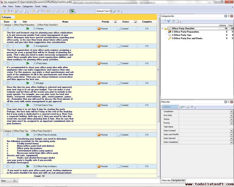 For organizing office celebrations it’s recommended to use some guide that shows you key steps of party preparation, gives a series of important tips, and focuses you on what you can do and what you can’t. This Office Party Checklist will give you all necessary information for party organization.