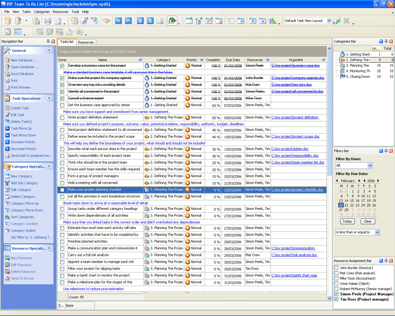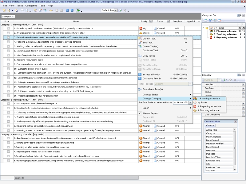 Project scheduling is a process that states how to manage time and resources to accomplish work. Use a scheduling software tool (VIP Task Manager is recommended) and t his developing project schedule checklist to plan and track the schedule of your project.