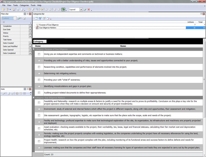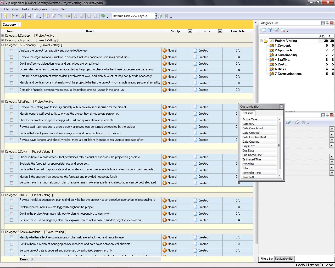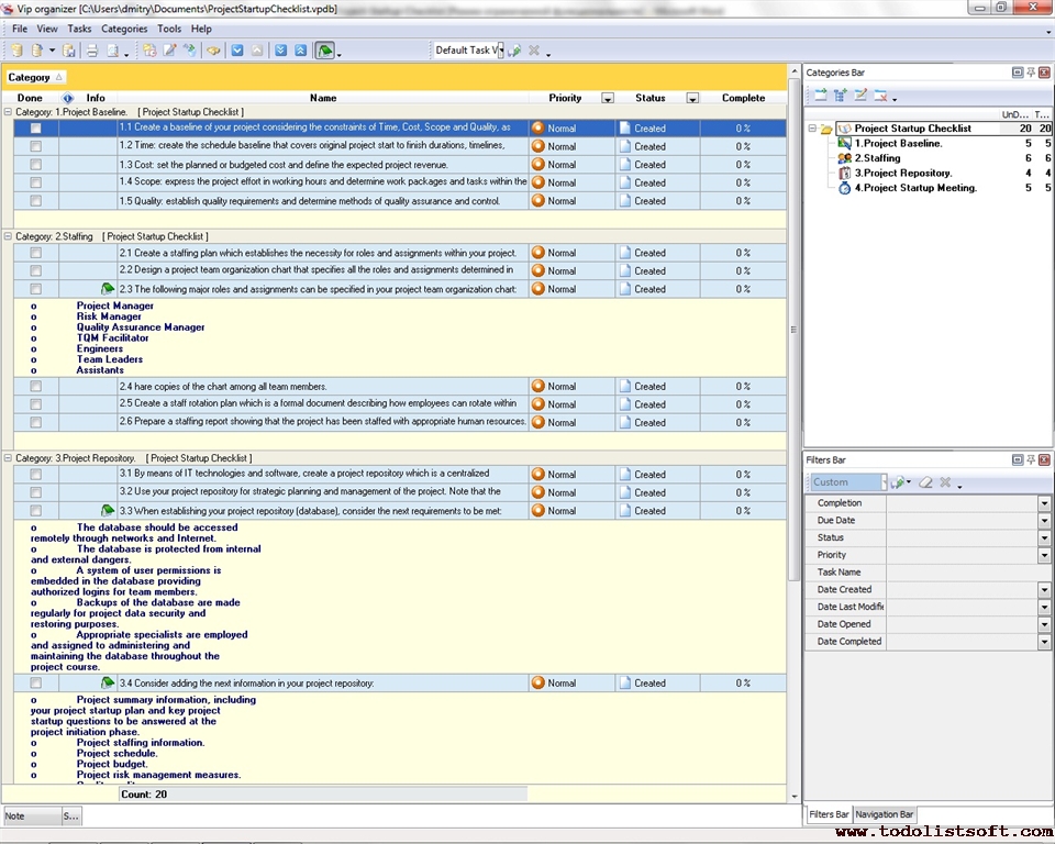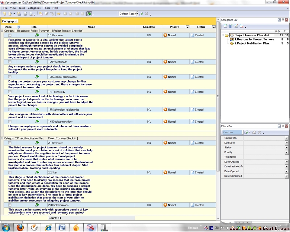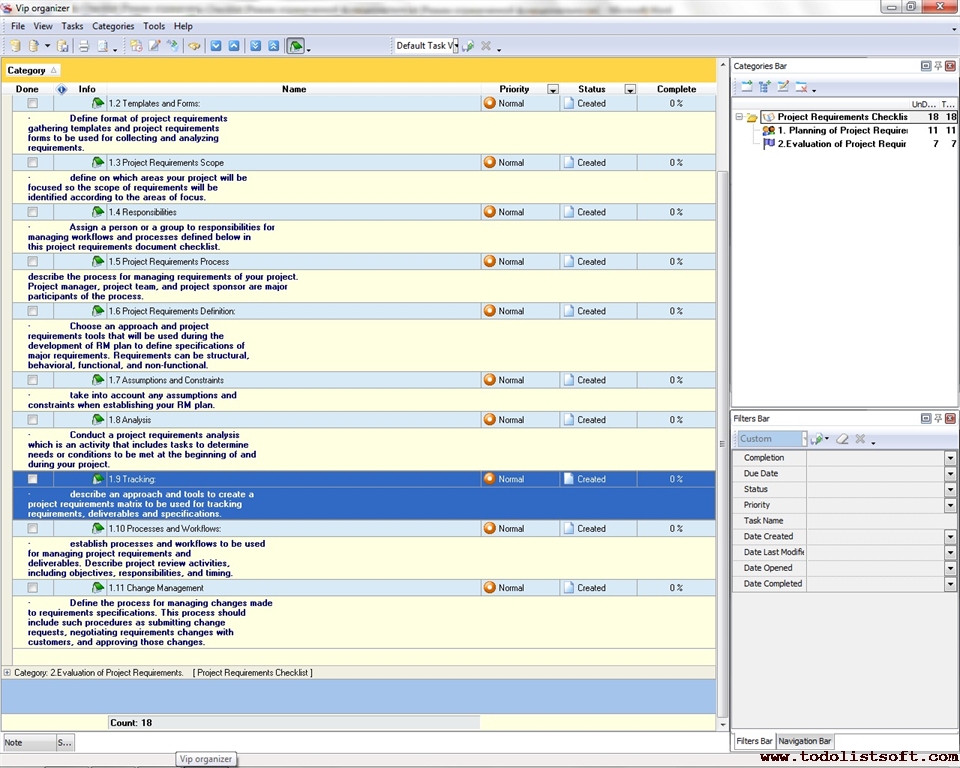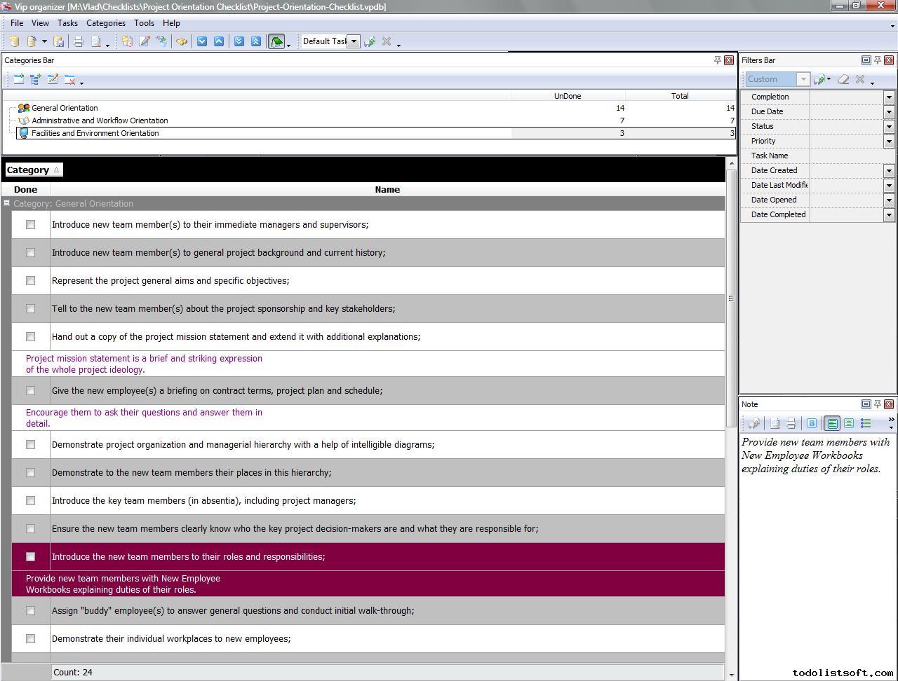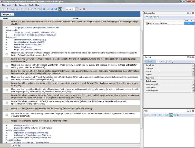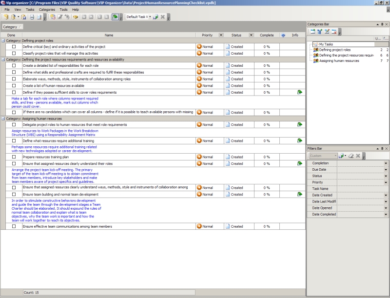 Use this Project Tailoring Checklist to tailor and incorporate your project to the business process environment of your organization. The checklist is a step-by-step guide that includes a range of tasks. You can use VIP Organizer software to do the checklist.