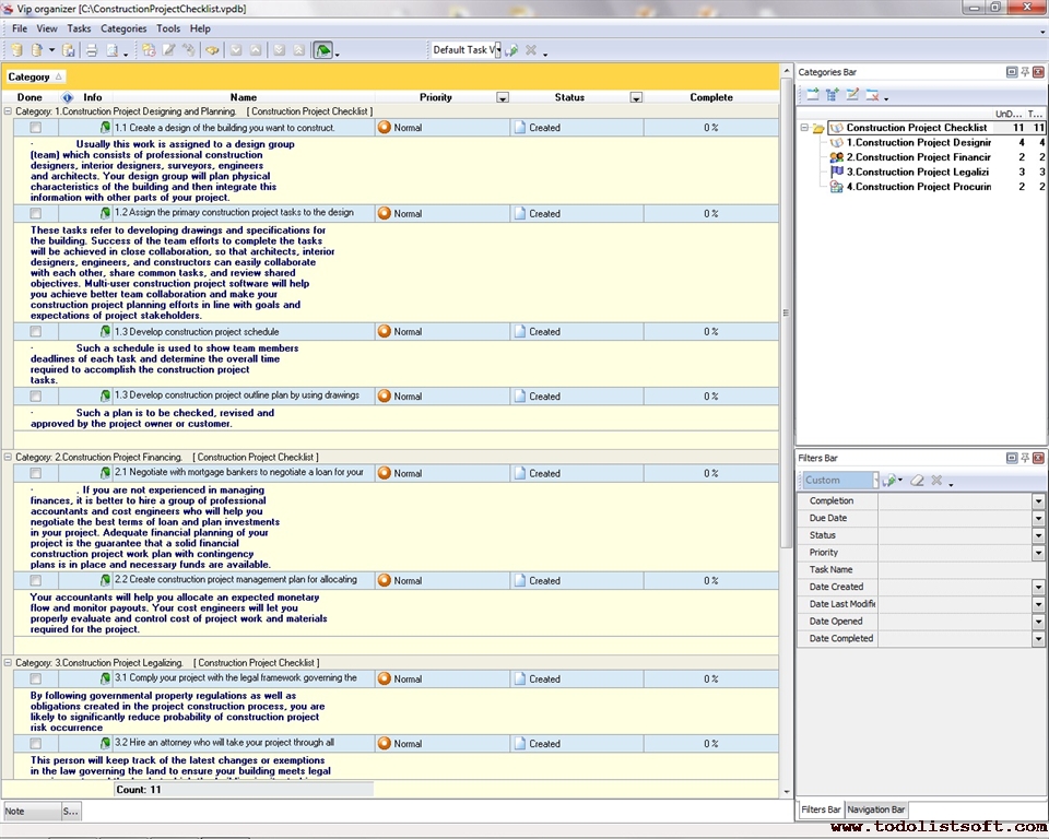 This Construction Project Checklist is designed to help project managers, constructors, architects and engineers to plan, schedule and budget processes for a construction project. You can use this checklist to get an idea of managing typical construction projects.