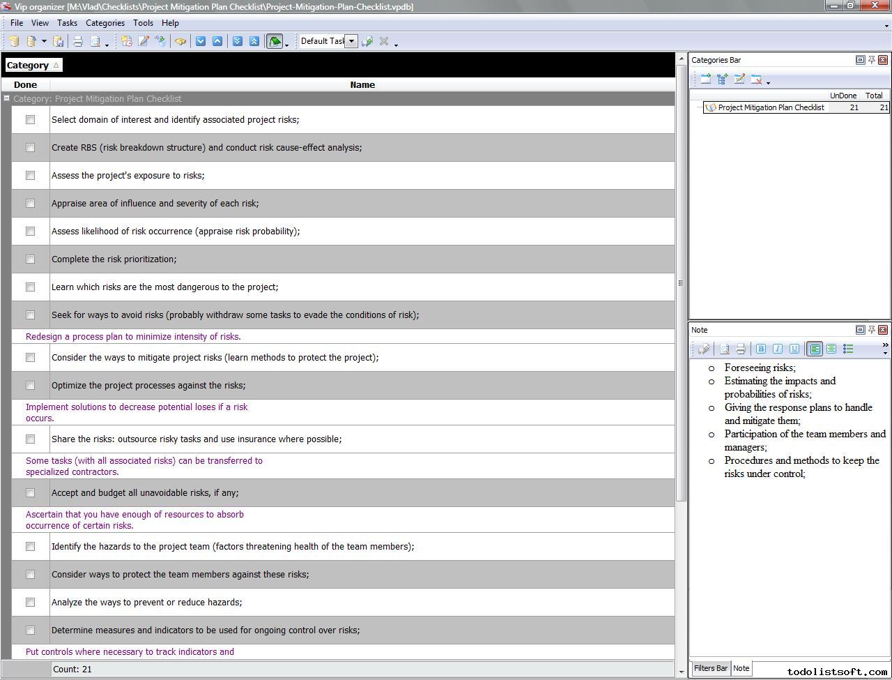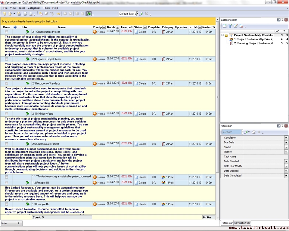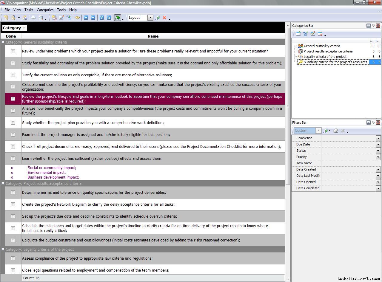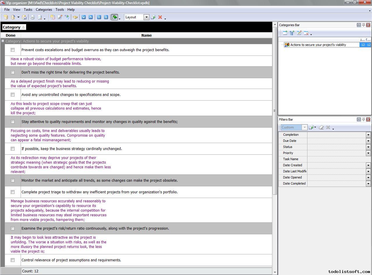 Project Viability Checklist is created for all business and project managers who wish to learn the principles to prevent their projects from losing their maximal benefits. With a help of this checklist you can correct and examine your managerial actions to know whether they secure or contradict the viability of your projects.