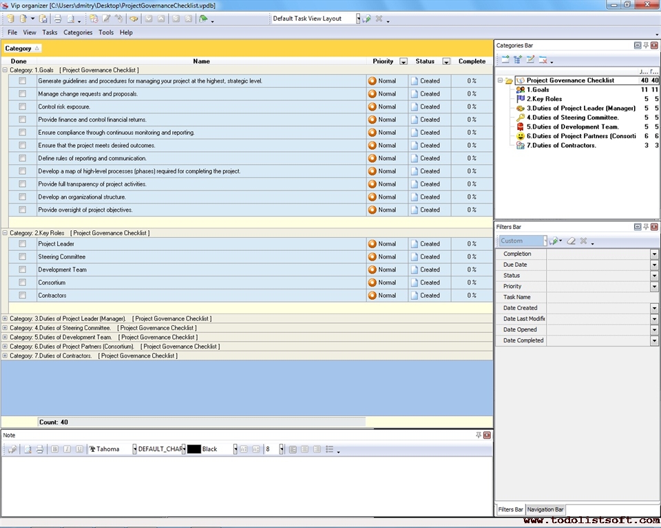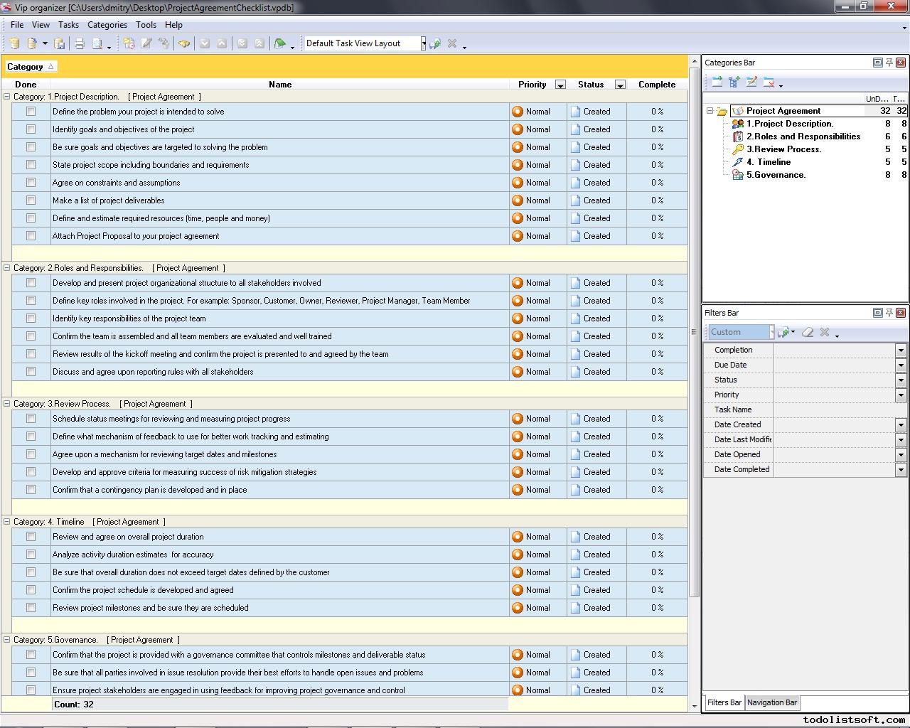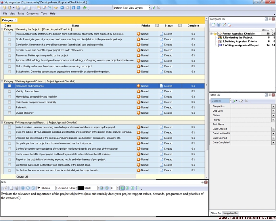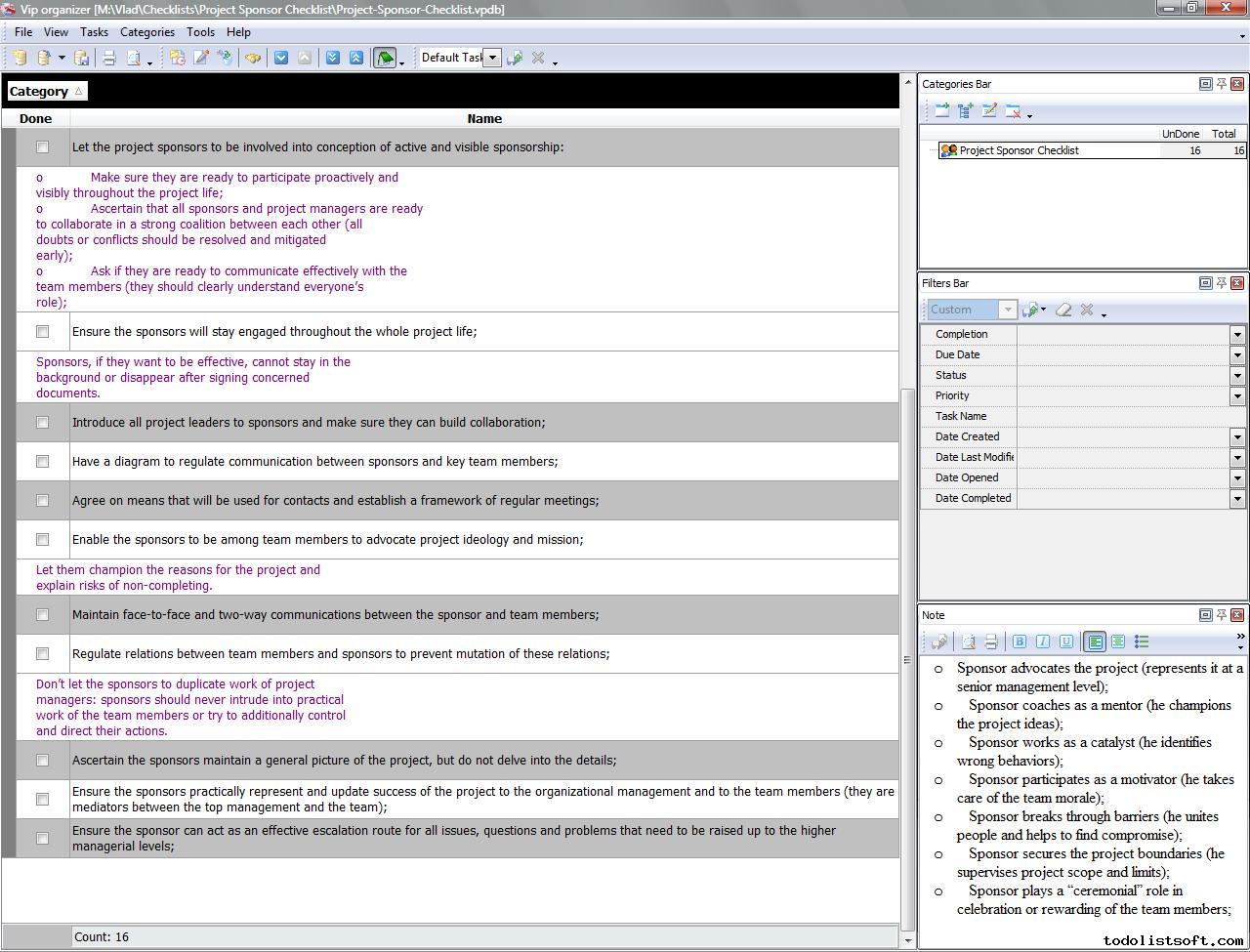 Project Viability Checklist is created for all business and project managers who wish to learn the principles to prevent their projects from losing their maximal benefits. With a help of this checklist you can correct and examine your managerial actions to know whether they secure or contradict the viability of your projects.