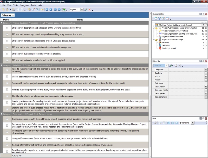 This Project Audit checklist will be helpful to those who would like to learn the purpose of this process and how the body of Project Audit life cycle is organized. This Project Audit checklist will explain what it is, how it is used, what activities it includes and what outcomes a project audit is supposed to deliver in a result