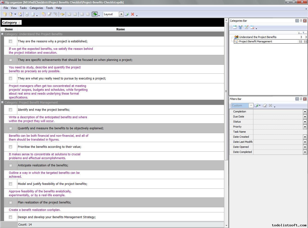 Project Benefits Checklist is created for project managers and organizations that want to plan and execute their projects in a really effective way – in a benefit-focused manner that allows developing the real value of projects. With a help of this checklist you can study and manage project benefits.