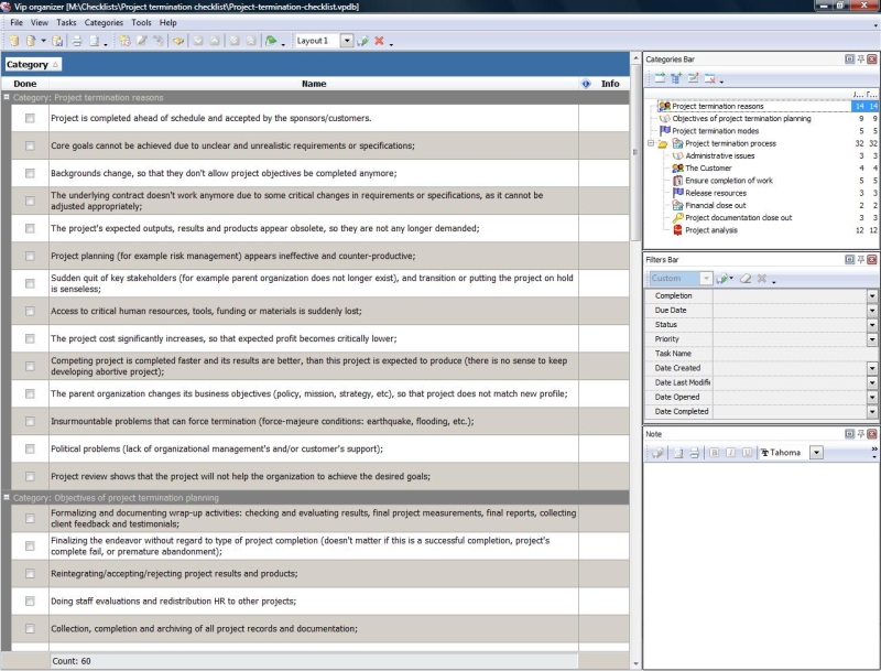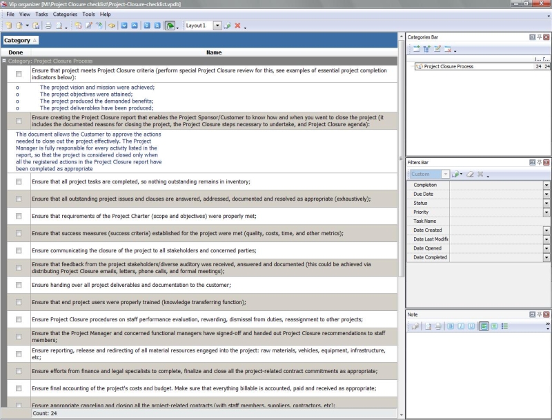 This Post-Project Checklist is designed to help you review your project and hold a post-implementation meeting after the project has been successfully completed and deployed. You can use VIP Organizer software to upload the checklist and use it in your daily practice of project management.