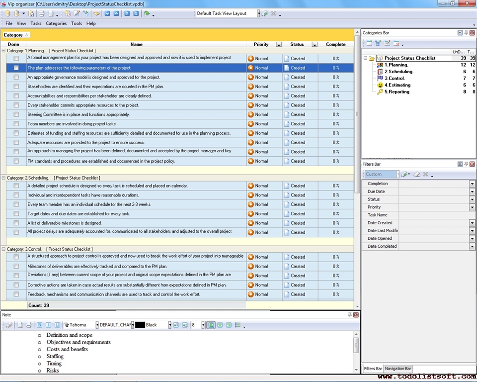 Project Analysis Checklist is created to help the project managers in conducting all-round analysis of their projects before they are started and while they are on the run. In this checklist you will find information on how to analyze project’s background, environment, organization and other things.