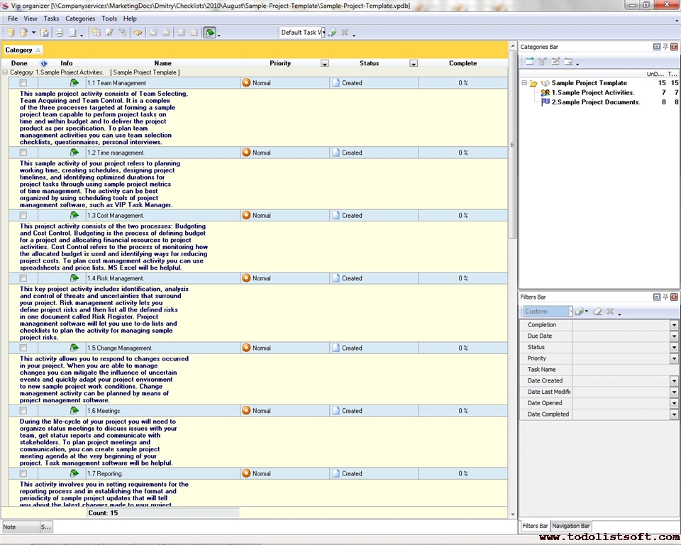 The idea of planning sample projects allows you to manage typical projects easier because you can create a series of sample documents and organize key project activities in advance before your project gets started. The given Sample Project Checklist will tell you how to plan a sample project.