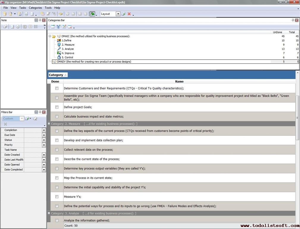 This Six Sigma Project Checklist is created to explain this famous business management strategy (initially invented by Motorola) to business managers who are interested in implementing it. Using this checklist you can study two methods included in it – DMAIC and DMADV.