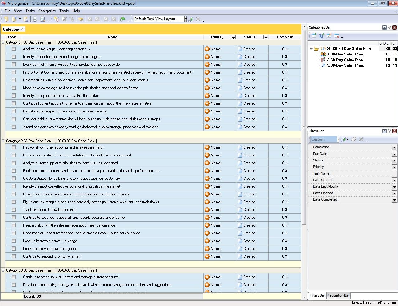 The following 30-60-90 Day Sales Plan Checklist is designed for people who have been just appointed to the role of sales representative. The checklist explains what tasks a new sales rep needs to do during 30, 60 and 90 days of the assignment. It is best used with VIP Organizer software.