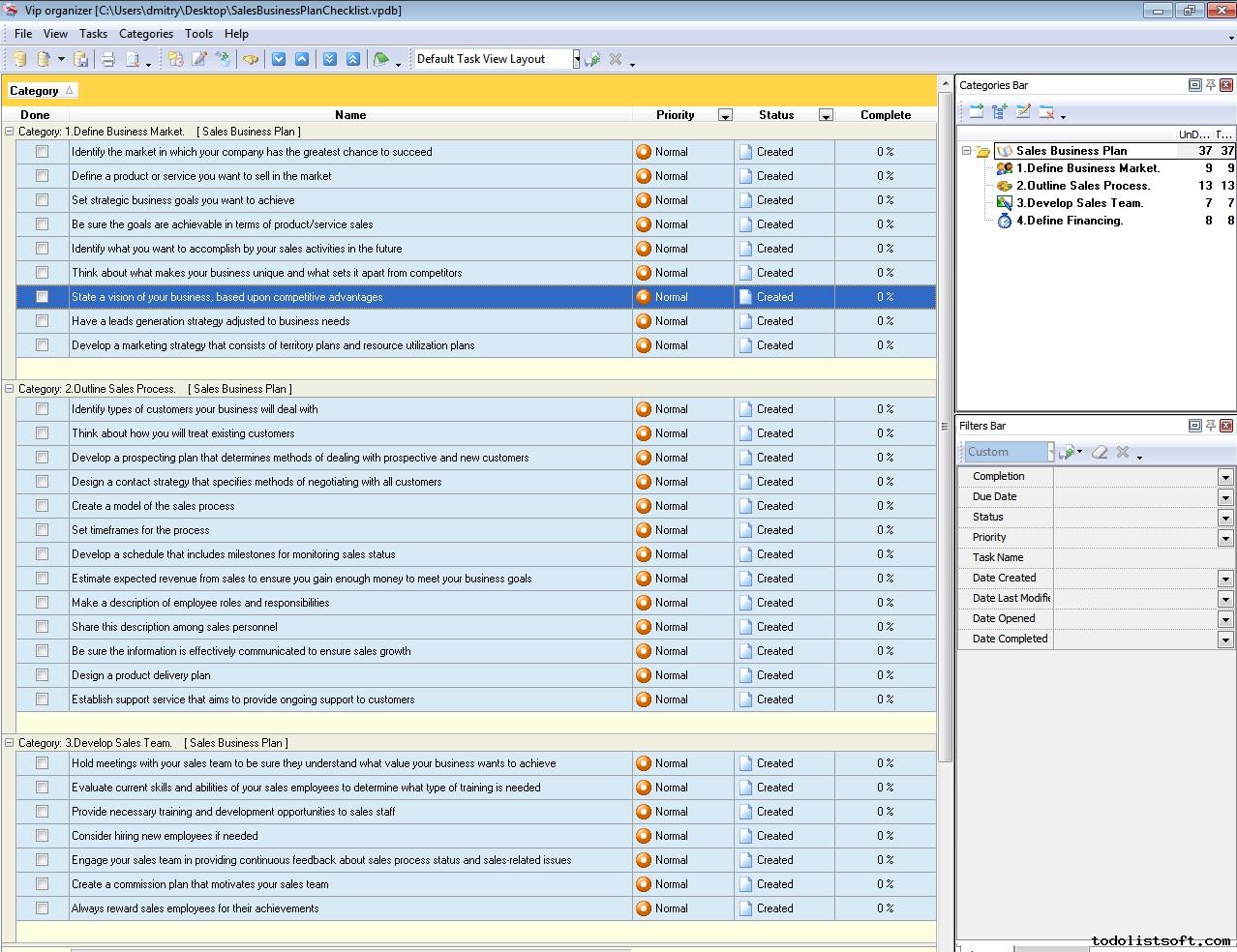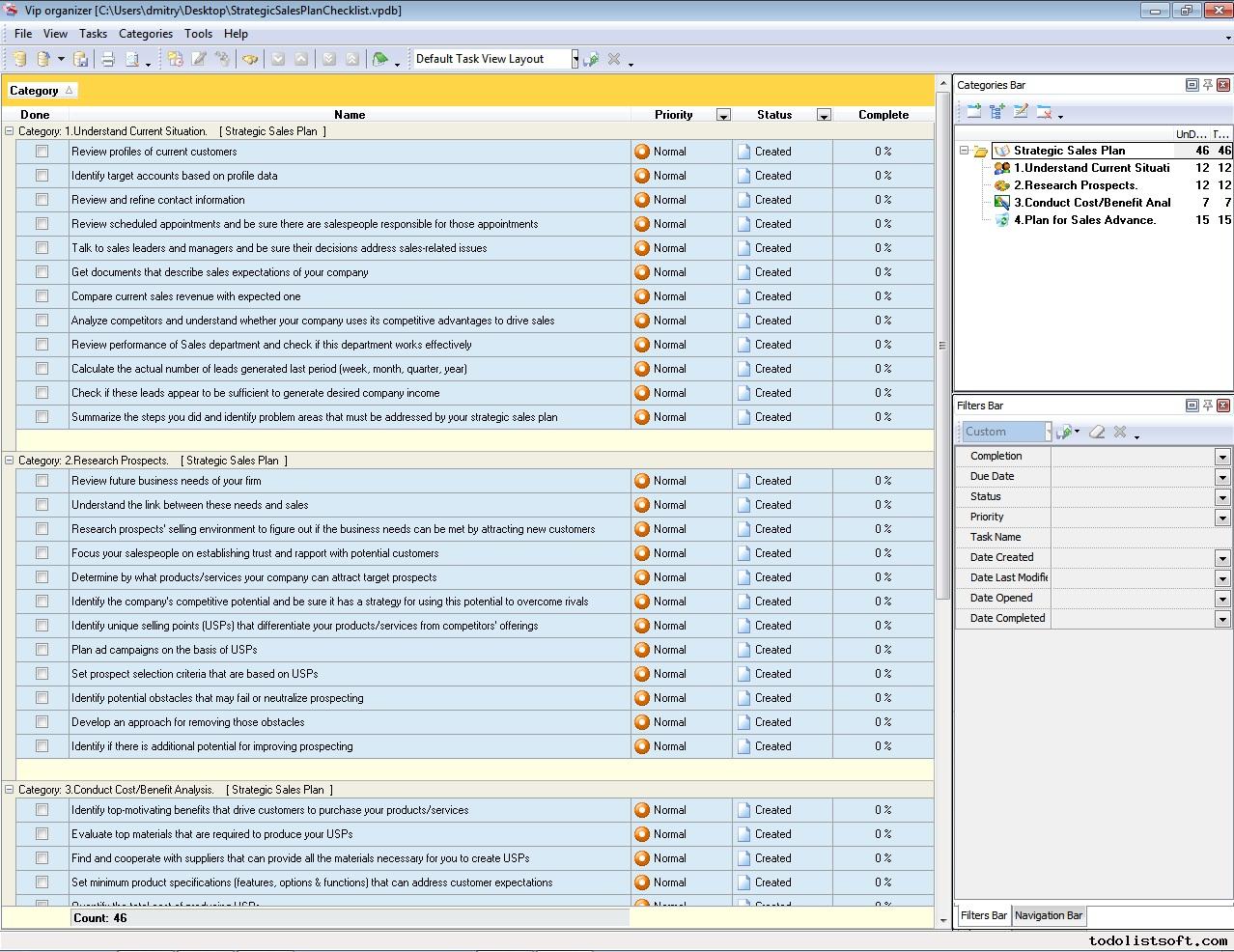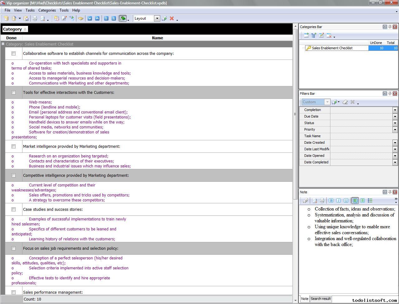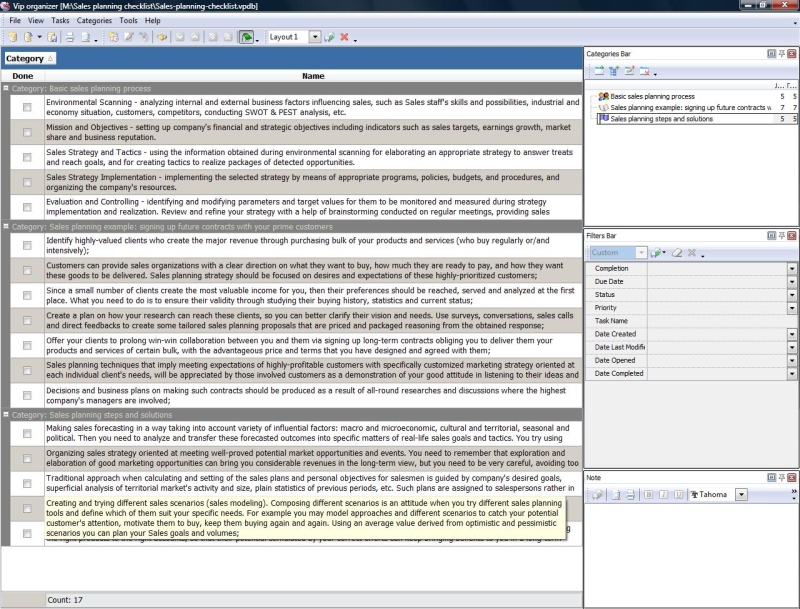 This Strategic Sales Plan Checklist explains what actions need to be done for creating a sales plan based on strategic business goals. This document is designed for sales managers, market analysts and other professionals involved in sales management. It is recommended to use the checklist with VIP Organizer software.