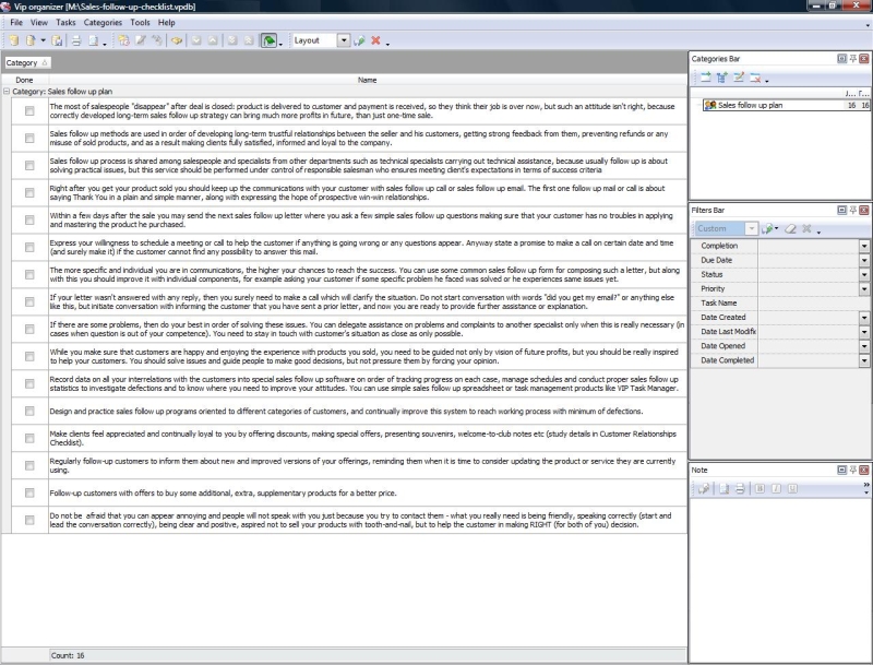 This sales follow up checklist will be useful to all salesmen who would like to elaborate their own effective sales follow up systems to keep good relationships with clients, making them willing to buy from them again and again. Learning this sales follow up checklist will explain you what this strategy is all about, as well as what should you do in order of maintaining client relations without seeming bothersome.