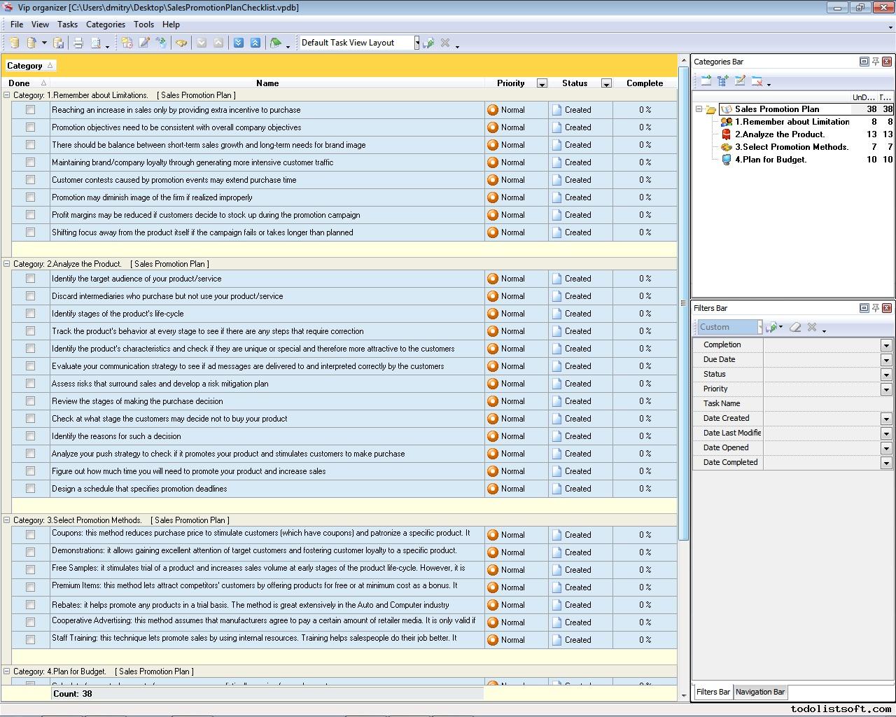 In this Sales Promotion Plan Checklist we describe a range of steps a marketer must take while planning for a promotion campaign. This document is designed in the form of a to-do list that a marketer can include in daily worksheets. The checklist is best used with VIP Organizer software.