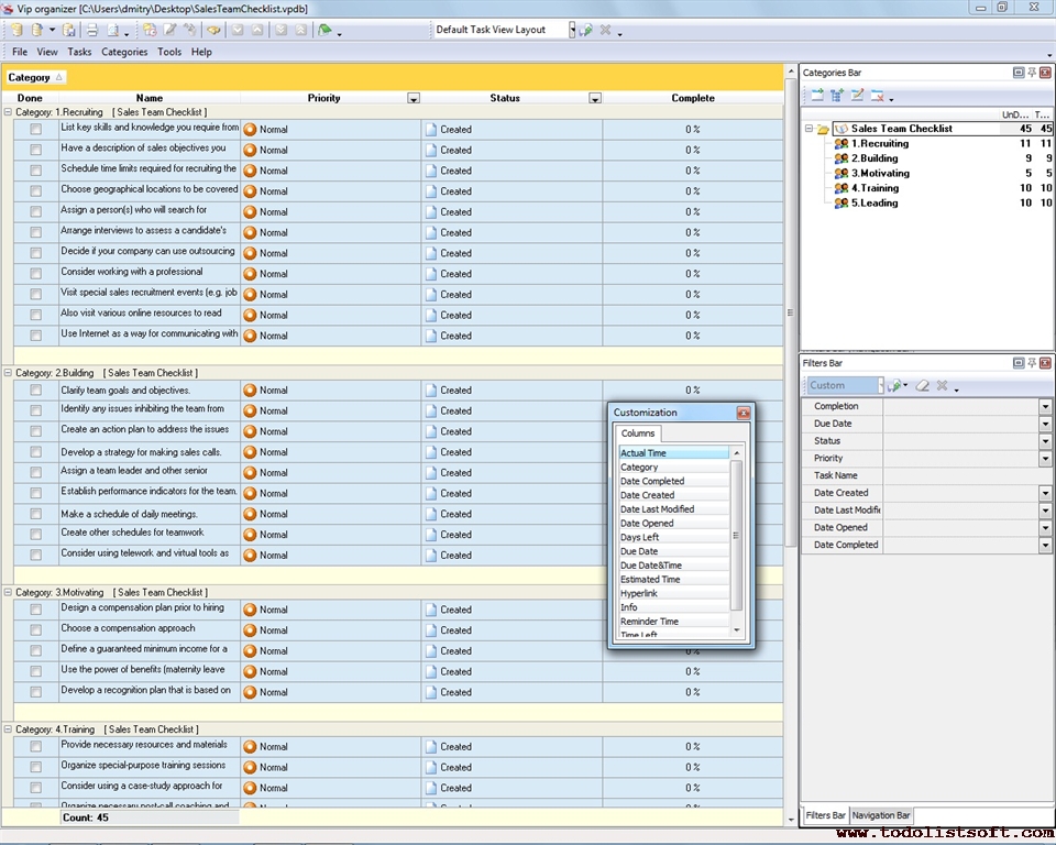 The following Sales Team Checklist describes 5 main activities you can undertake to manage your team. Recruiting, Building, Motivating, Training and Leading are those activities. The checklist will be helpful for sales dept heads, managers, team leaders and other seniors.