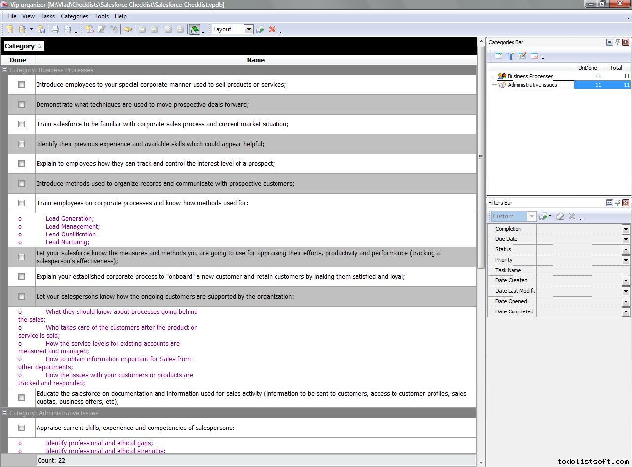 Salesforce Checklist is created for business owners and sales managers who wish to organize their salesforce to be well-trained, effective and responsible. With a help of this checklist you can define whether your salesforce is properly introduced to corporate processes and administrative matters.