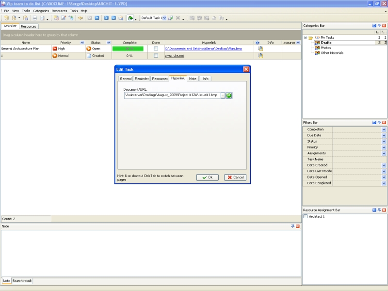 Integral part of architect's workflow is drawings, schemes and photos. The architect uses these materials for processes of planning, designing and constructing. To improve task performance, he can attach materials to task as files and hyperlinks. In task management software the column "Attachment" will display the link or file path to the drawings or schemes in the task list view. The architect can open the file in one click and continue to work with the attached materials. If the architect works in the team, he can share his drawings with the team leader by giving the access to his files. |
