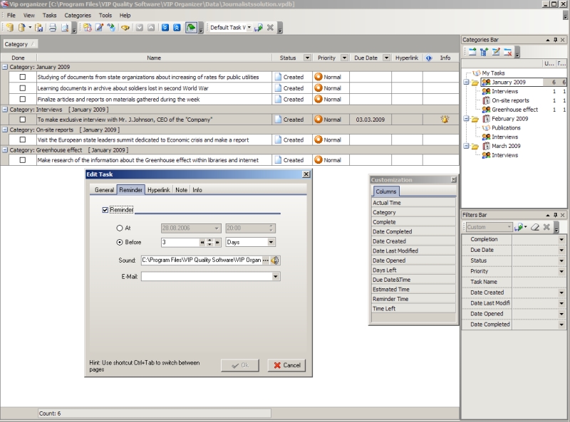 VIP Organizer software is a good solution for journalist which wants to organize individual professional activity. It is personal easy-to-use tasks management software which allows journalist to plan and categorize tasks, set timelines and priorities, manage notes and documents, set task reminders, create printable checklists and so on.