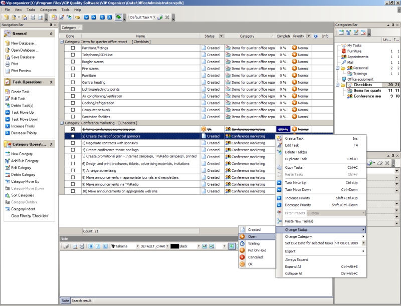 - VIP Organizer software is a simple and effective solution for office administrator that can use it for planning and controlling tasks and appointments. It is individual tasks management product that can help office administrator to organize his/her workflow, register calls and mail, categorize and prioritize tasks, set due dates and reminders, manage notes, documents and create printable checklists.