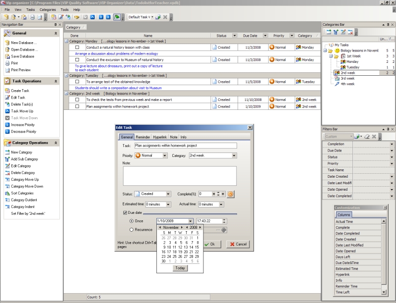 VIP Organizer software is a good solution for a teacher who wants to organize individual professional activity. It is personal easy-to-use tasks management software which allows the teacher to plan and categorize tasks, set timelines and priorities, manage notes and documents, set task reminders, create printable checklists and so on.
