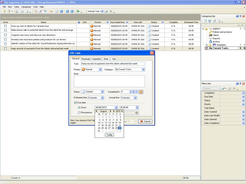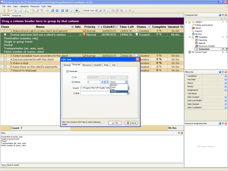 The workday of the travel agent usually is filled with a lot of various events such as appointments, phone calls, meetings, interviews, negotiations and other. In variety of these events the travel agent can miss some of them and forget important actions he should do. The travel agent can use task reminders in task management software to prevent himself from missed appointments, forgotten phone calls, procrastinated tasks and delays. He can set reminder for an event at precise date/time or some weeks/days/hours/minutes before it happens. In task management software reminders can be set for each task whether it is appointment, phone call, or some another action. The travel agent can send task reminder by email to one or several recipients. |
