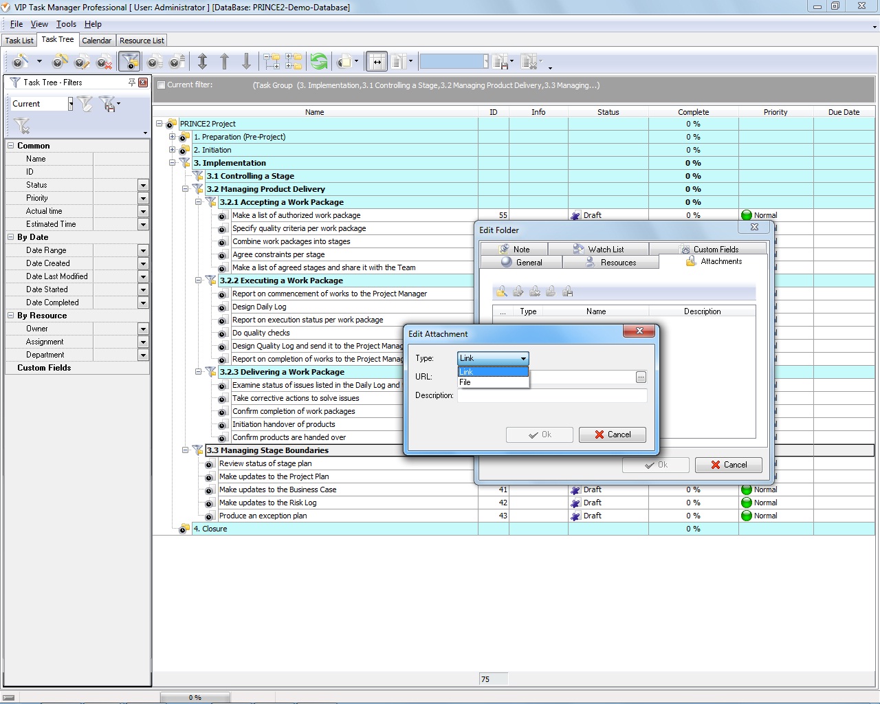 These processes can be organized into simple and manageable tasks created with help of VIP Task Manager. By using this software you can represent the Implementation phase of your PRINCE2 project as a multi-level hierarchy of groups and tasks monitored by your Project Manager and performed by your Team. Let’s find out what sample tasks you can use to plan the processes of the phase and how you can do it in VIP Task Manager.