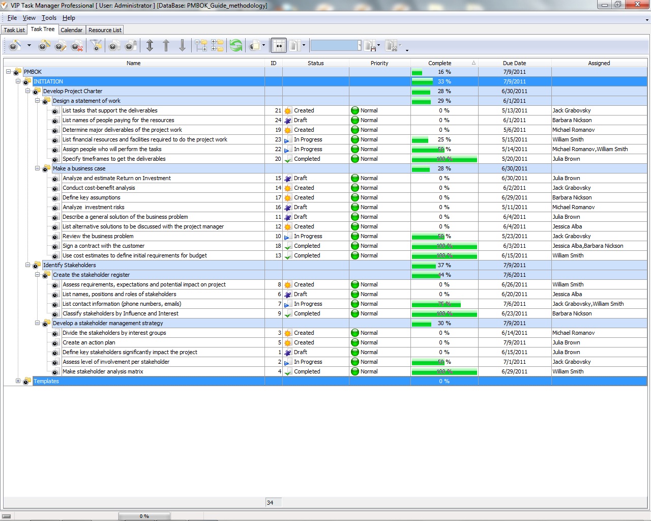The two processes and their steps and activities can be successfully managed with help of VIP Task Manager. This software allows using simple tasks to plan and schedule the initiating processes and allocate responsibilities between the people involved in the same projects. For example, VIP Task Manager features Task Tree view that lets divide the processes into a hierarchy of tasks scheduled by Due Dates and assigned to a number of Resources. Here’s how this hierarchy may look like: