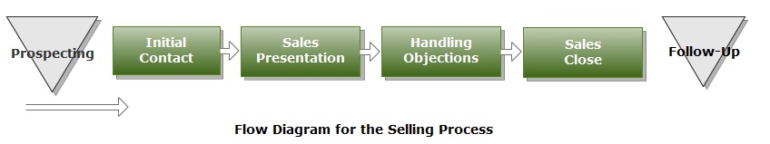 The second task is performed while considering results of the previous task. The team needs to design a flow diagram for analyzed processes. For example, such procedures as Prospecting, Initial contact, Presentation, Handling objections, Sales close, and Follow-up are included in the selling process. The team creates a flow diagram that represents the process boundaries (Prospecting and Follow-up) as triangles and the rest procedures are squares. Arrows between the components of the diagram are added to show the execution order and relationships (look at the picture below).