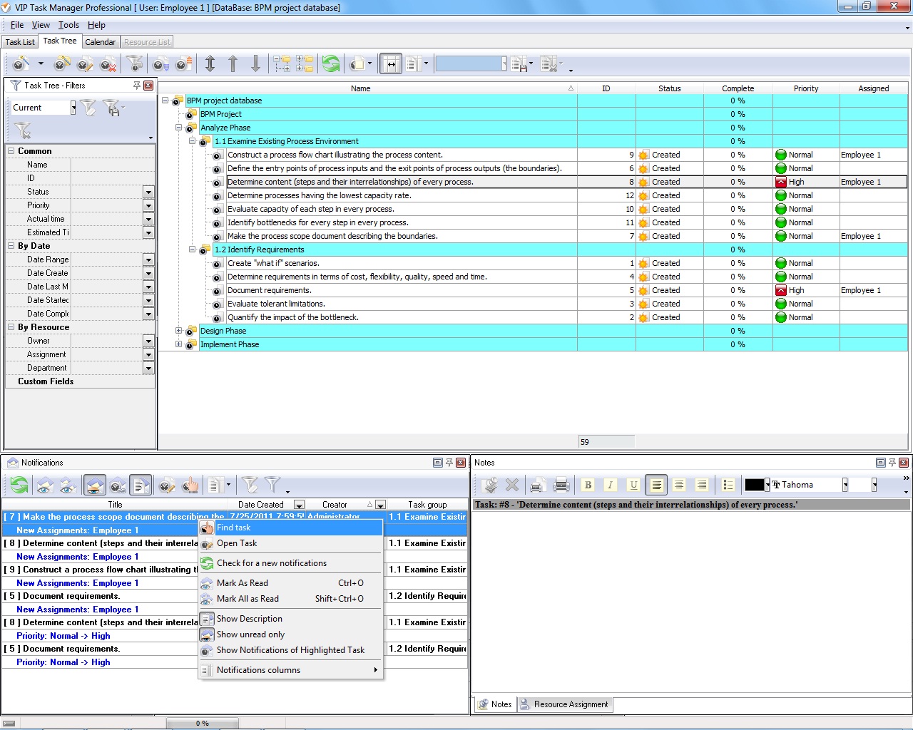 The processes and tasks of the Analyze phase can be managed with help of VIP Task Manager. Your expert team can use this software solution to develop a BPM project that consists of a hierarchy of tasks assigned to team members. Bellow you can see an example of project tasks that can be created in Task Tree view of VIP Task Manager.