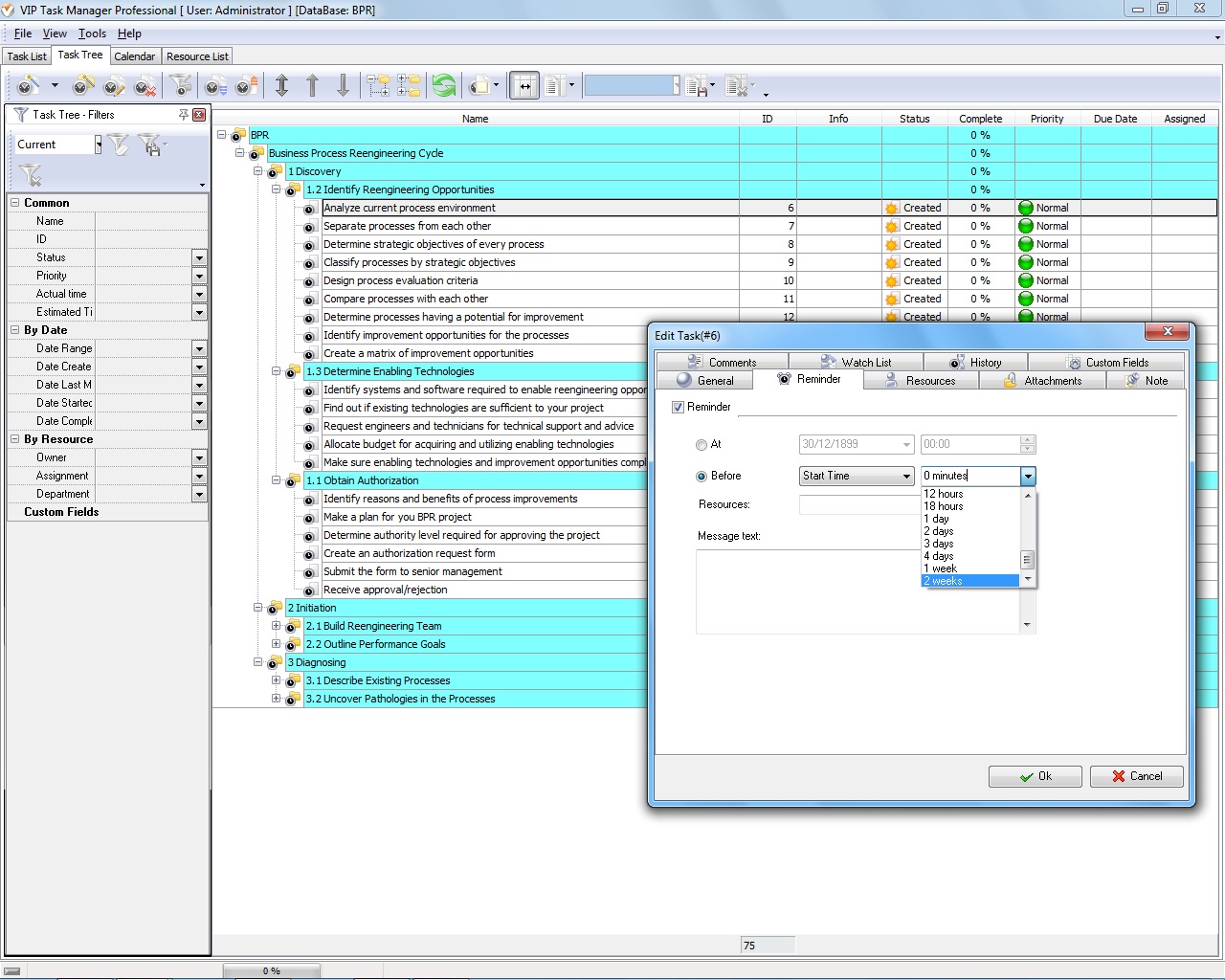 Below we present a checklist of tasks referring to the key activities of the Discovery phase. You can use VIP Task Manager to create such a checklist as well as add new tasks and groups. The software allows you to plan and manage your BPR project.