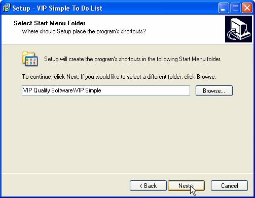 If you want the shortcuts to be placed at a particular location you should click on ‘Browse’ button and select this location. Otherwise the shortcuts will be created in VIP Quality Software in Start Menu folder. Click ‘Next’