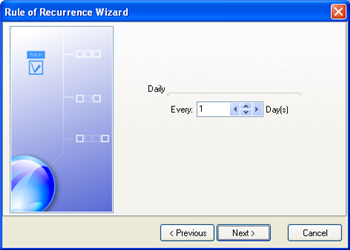 Then you need to check the Recurrence option in the dialog you opened and the Rule of Recurrence Wizard will open. In this wizard you can step-by-step define all parameters for recurrence you need.