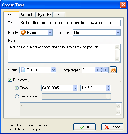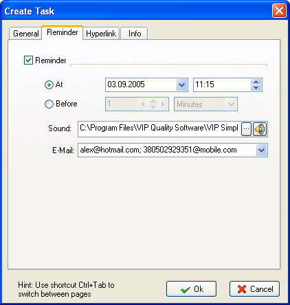 Reminder - check box enables the reminder for the task at the specified time.