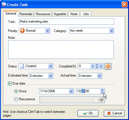 If you want to schedule a recurring task (ex. the one that occurs each Monday or first week of the month), you should activate Due Date box and select radio button Recurrence.