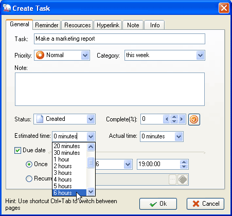 When you plan a task, you can estimate the time you need to accomplish it. Select a time period from the drop down menu or type it in Estimated Time field, ex.: 5 hours (h), minutes (m) days (d), weeks (w). It will help you allocate workload and compare your estimations with actual time to plan tasks better next time.