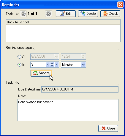 Popup desktop message shows the task info and allows you to edit, delete and check the task within Reminder window. You can postpone the alarm for a certain time period by Snooze or clear the reminder by Close button. |